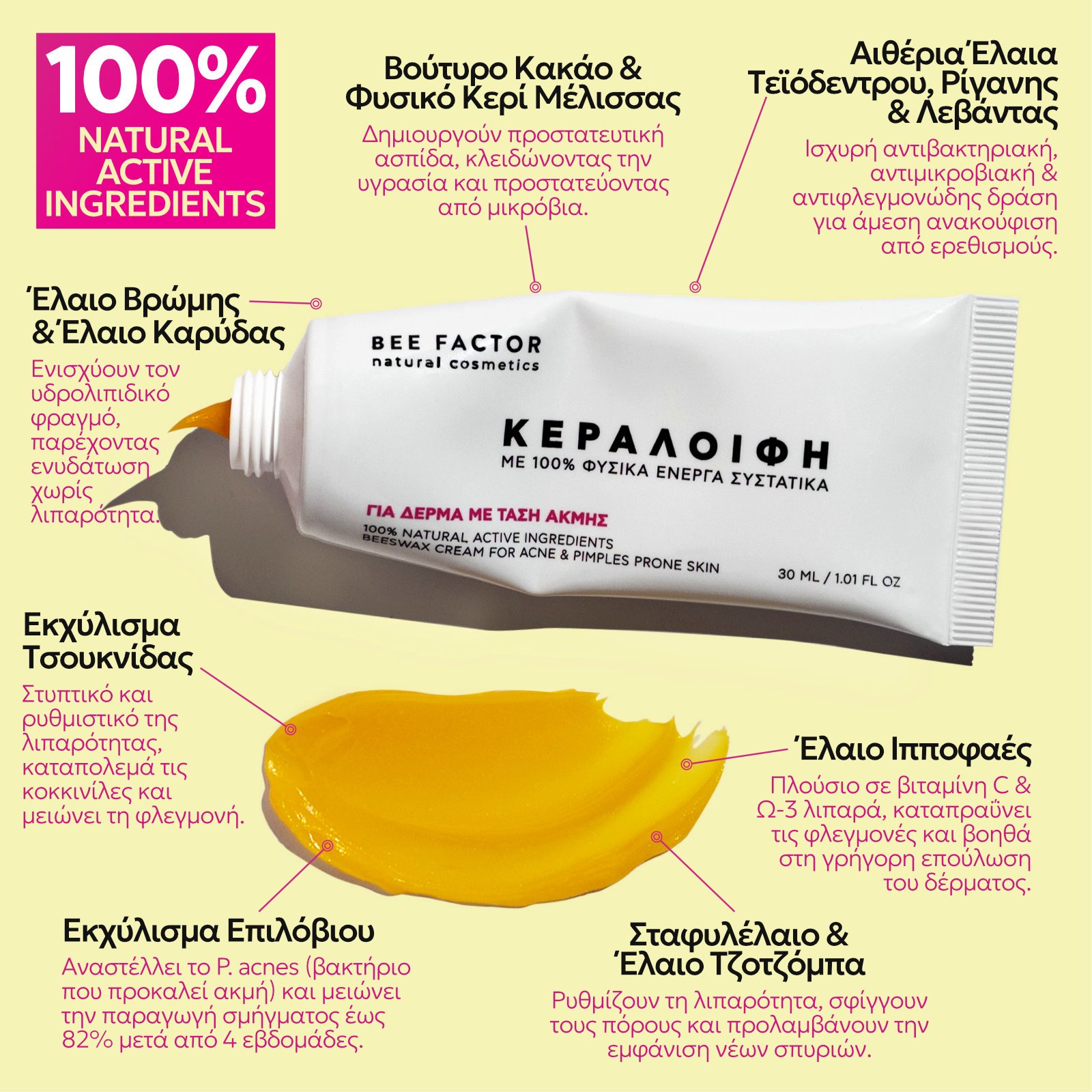 Η Bee Factor Κεραλοιφή για Ακμή & Σπυράκια είναι μια 100% φυσική θεραπεία που καταπολεμά τα σπυράκια, τη λιπαρότητα & τις ατέλειες της επιδερμίδας, χωρίς να διαταράσσει τη φυσική της ισορροπία.
